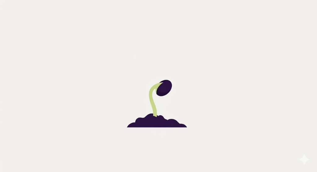 A simple dusky-pink cotyledon pushes from a dark-violet seed.