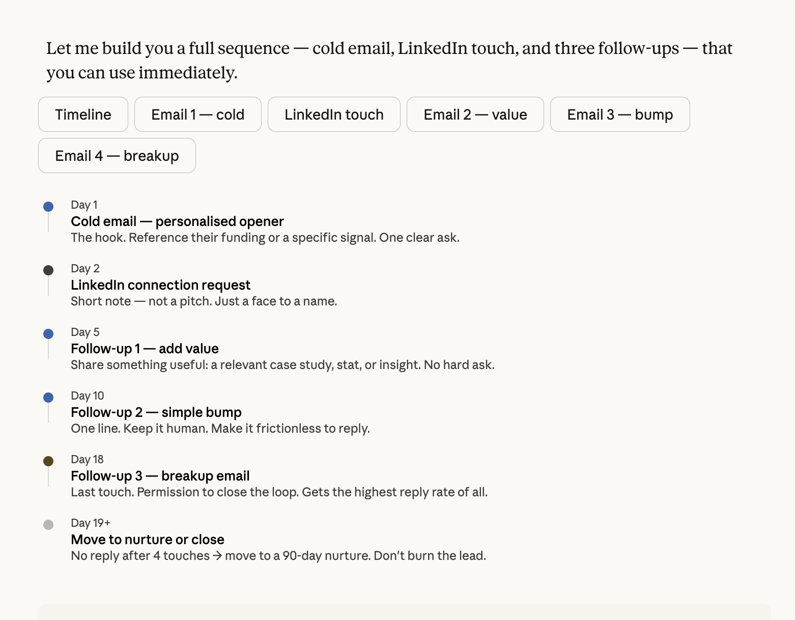 Claude will then build your campaign sequence for you. Here is what it recommends for me: