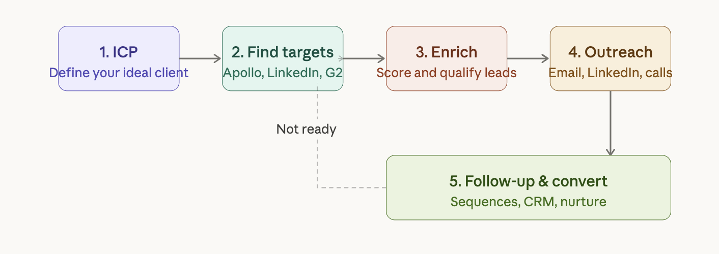 Stage 5 — Follow-up and convert. Most deals come from follow-ups. I can build a multi-touch sequence (email + LinkedIn + call) and help you design your CRM workflow so no lead falls through the cracks.