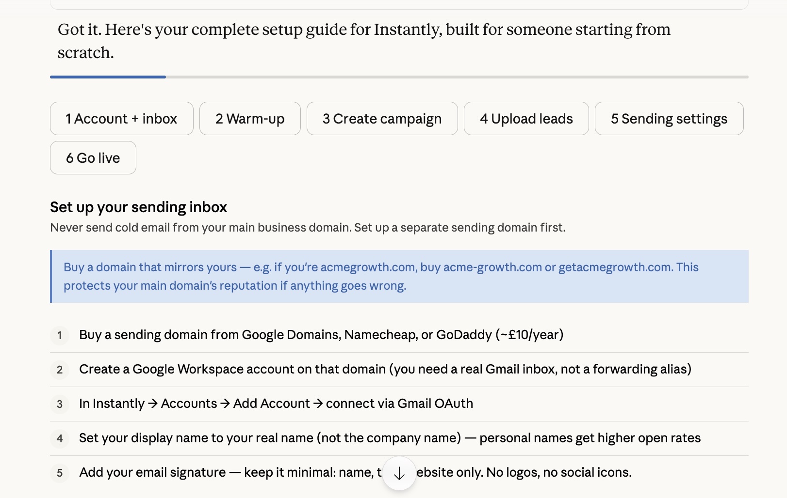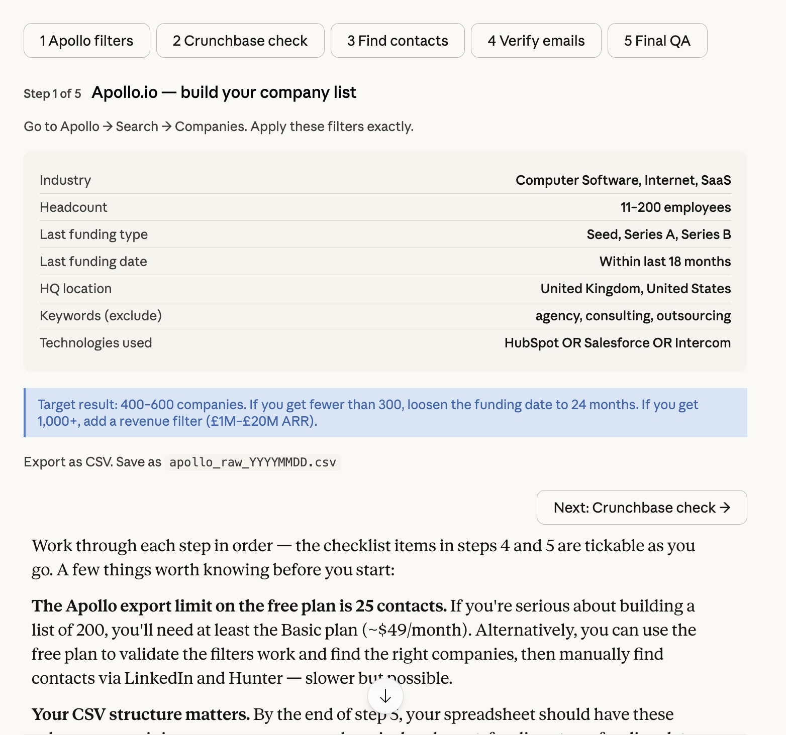 Claude will give you a clear workflow on how to build your lists – here it shows a 5-step process, along with handy tips along the way to help you.